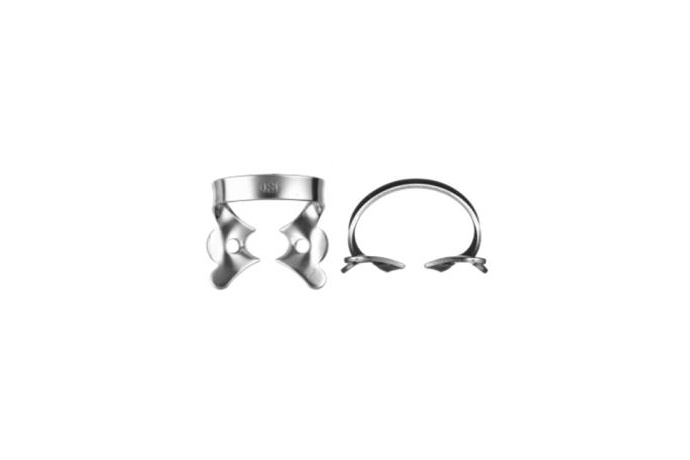 Кламп №1 для клыков и премоляров верхней и нижней челюсти, для зубов с сильно разрушенной или отсутствующей коронковой частью. Щечки клампа имеют воронкообразный изгиб в апикальном направлении.
